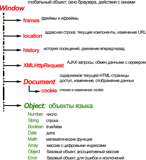 Конечно, в javascript есть еще много объектов и свойств, например, устаревших типа images или forms, которые обычно включают в иерархию. На рисунке их нет, так как они почти не используются.