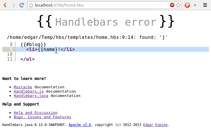 Handlebars.java errors are reported through a very nice HTML page.