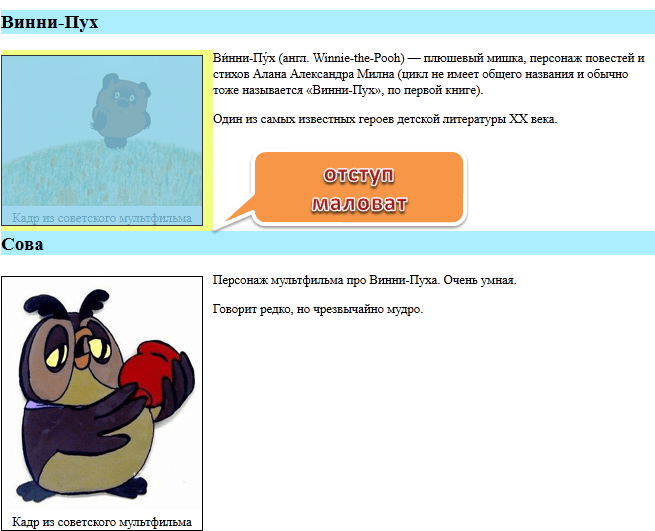 float-элемент – картинка «Сова». Он был сдвинут влево. Согласно алгоритму, он двигается до левой границы или до касания с другимfloat-элементом, что и произошло (картинка «Винни-Пух»). - Так как у совы