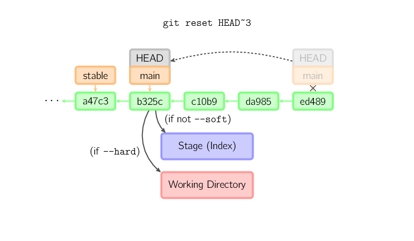ファイル名なしでコミットが指定されると、現在のブランチがそのコミットに移動し、ステージの内容はそのコミットと同じになります。--hard が指定されると、作業ディレクトリも更新されます。--softが指定されると、どちらも更新されません。