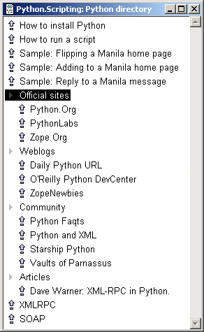 OPML gets its own domain. Paranoid thought for the day. The election crisis is a cover as in Wag the Dog. I got this idea as I watched the Reps cart out the Congressional Medal of Honor winners. "They're trying to get the support of the military," my paranoid mind concluded. What are they getting ready for? What if the US Supreme Court soils itself? How long before there are tanks in the streets? Fawny.Org: ISSN for Weblogs. "You can apply for and use an International Standard Serial Number for your Weblog. Your blog will then officially exist in the worldwide standardized encyclopedia of periodicals." What is Babylon? Looks deep. My article on OPML in XML Magazine is running now. Starting to get email. Unfortunately the example is in error, it's not valid XML. Oy. Murphy works in strange ways! Here's a correct rendering of the example, now I see why we got in trouble, on layout they must have needed to adjust the width, and misunderstood that the minuses are not part of the XML. We'll do better next time.. Stan Krute is working on a Radio UserLand tool that moves OPML data in and out of Palm Pilot PDB files. Fascinating article by Bricklin about a new Sony product that hooks into a system that knows what your local radio stations are playing. "BDS gets their information by having computers around the country that listen to a number of radio stations. Using a proprietary algorithm, they create signatures for songs as they are played, and compare them to songs in their database." Wired: "Needless to say, the people who work at the Amazon distribution center are cut from a different cloth than the scripting gurus in other Internet towns." Yo! I did a directory for the Samples website. Took about 15 minutes. It's not hard. More tweaks coming for sure. Then I included the Samples outline in the Radio UserLand directory. To the reader it appears as if it's part of the same directory, even though it's stored on a different server in another part of the country. When you browse the site, you may have trouble figuring out that they're on different servers. That's what "seamless" means. The new rules for cross-website inclusion are explained. We only refresh the OPML of the included outline once per hour, to keep the site fast. If you're building directories, note that as of October, Manila serves OPML for any message, whether or not it was edited in an outliner. Brent posted an announcement on 10/6. This is an important capability for the cross-website inclusion feature.