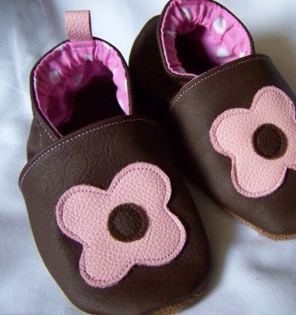 ... chaussons taille 23 en cuir chocolat et rose, doublure coton rose à pois blancs et fil assorti, patron Petit Citron...