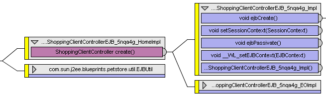 Performance problem #2: The ShoppingClientControllerEJB is a stateful session bean. Figure 5 shows the portion of the tree that gets the bean, and the tooltip for the create() method on the home class. Pet Store takes 6.013s (D) to create a ShoppingClientControllerEJB. That's 7% of the total time to service the request. What's going on here?