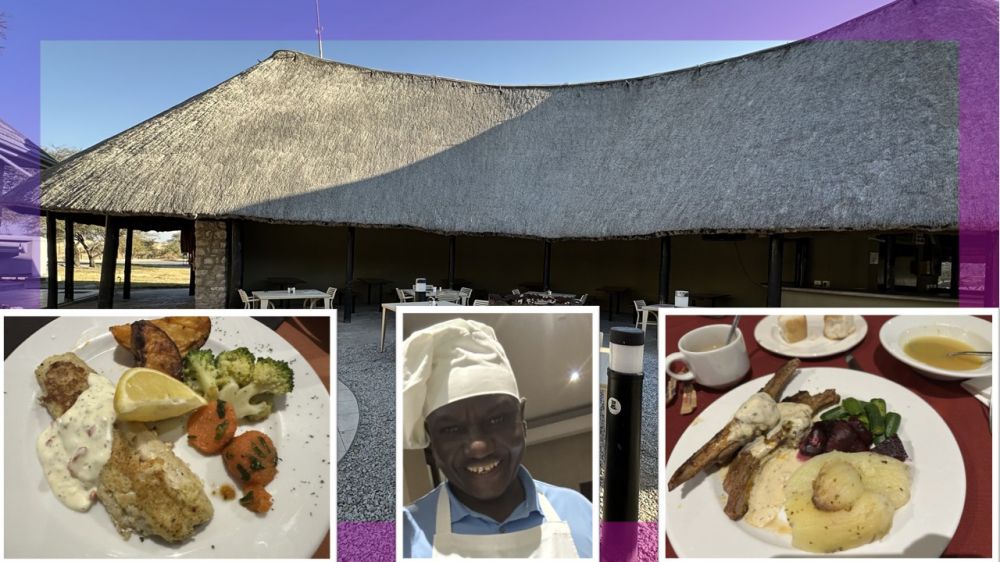 Etosha国家公园内的Okaukuejo营地餐厅,布局上洋溢着浓郁的非洲风,但早晚餐主打西点。