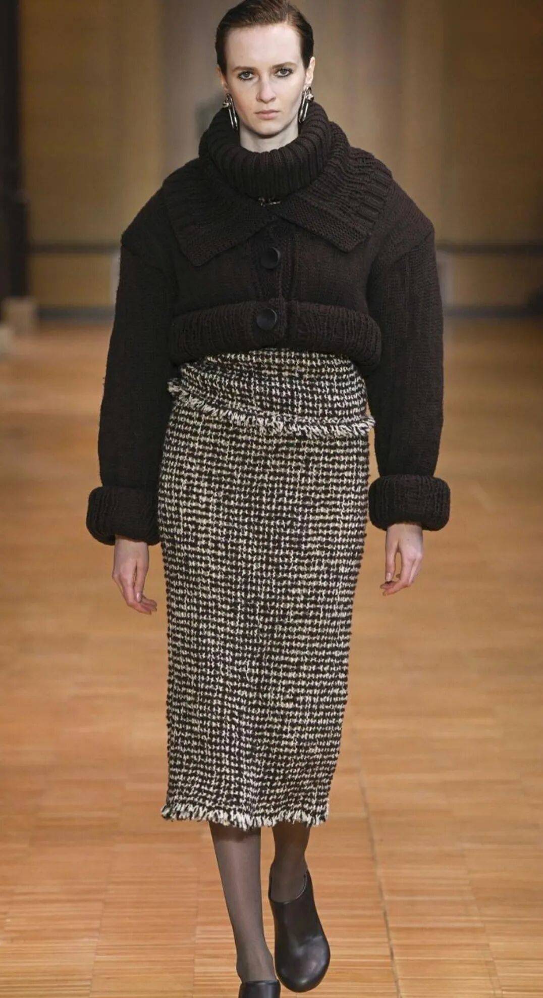 *在棕色系的颜色中,这些棕色颜色的低调朴素,在不同的面料中多了质感差异,休闲的上衣在皮草材质中,厚实温暖,而搭配的裙装,在开叉的不规则线条中,也多了不少设计感。