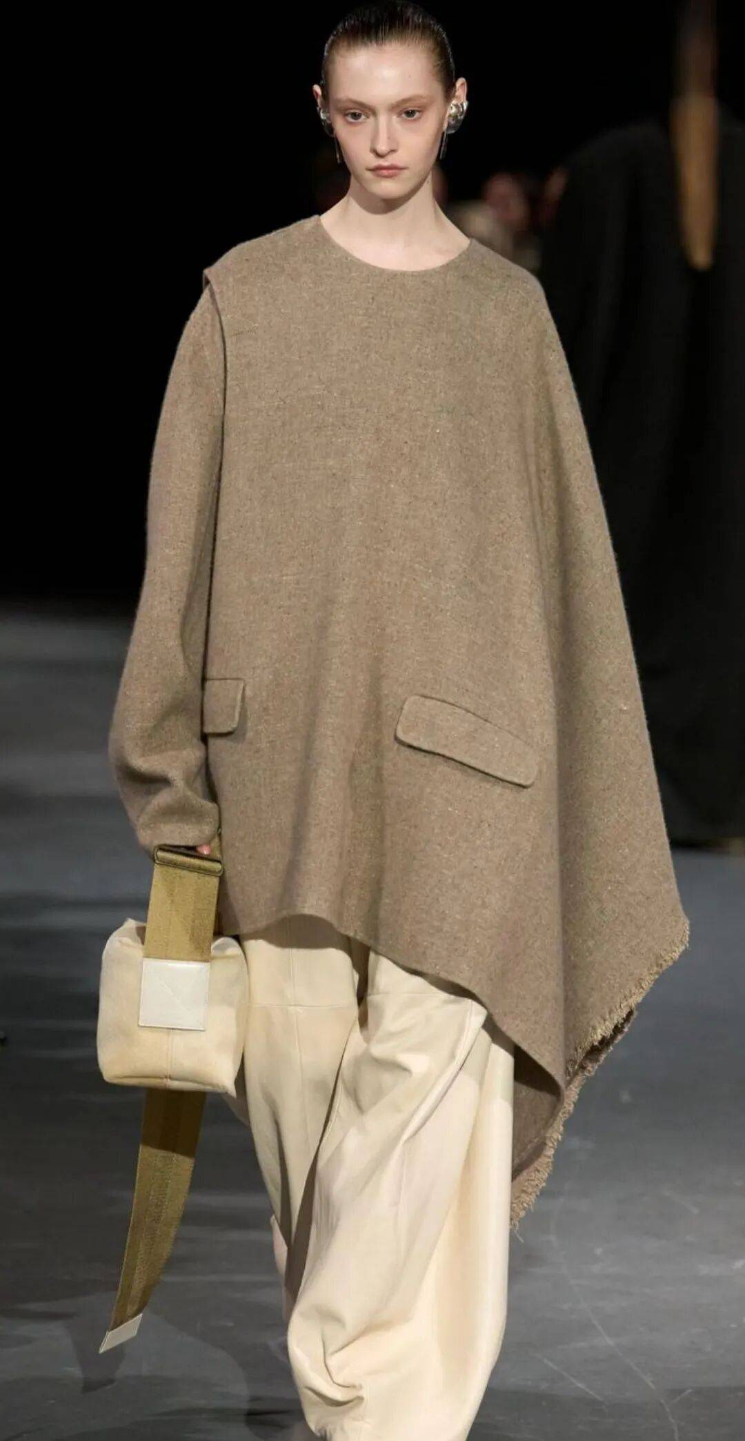 *在实用主义的潮流大河中,宽松流畅的剪裁设计,也深受欢迎,比如一些茧型大衣、斗篷元素等设计,在强调舒适性的同时还多了动态美感。