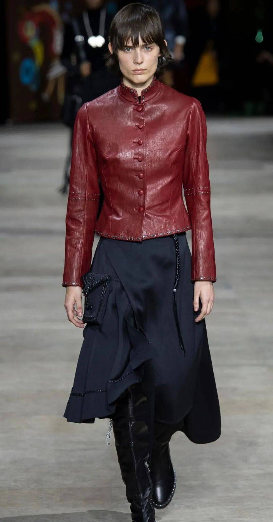 *红色的休闲上衣在纹理的皮革质感中,修身增加了腰身的曲线感,而在和藏青色裙装的搭配中,休闲也更优雅。