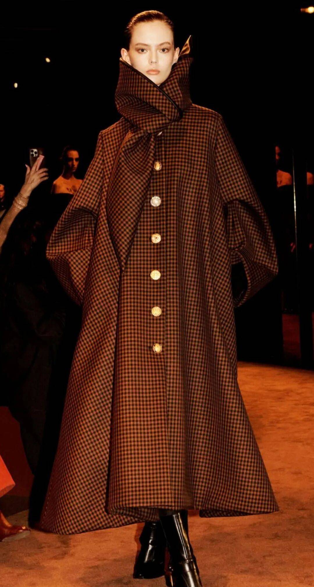 *长款的大衣在这些A字廓形的服装上,棕色颜色和黑色之间的搭配,色彩的对比在撞色差异也多了格纹的简约经典气质,而袖子还有夸张更多设计的时尚感。