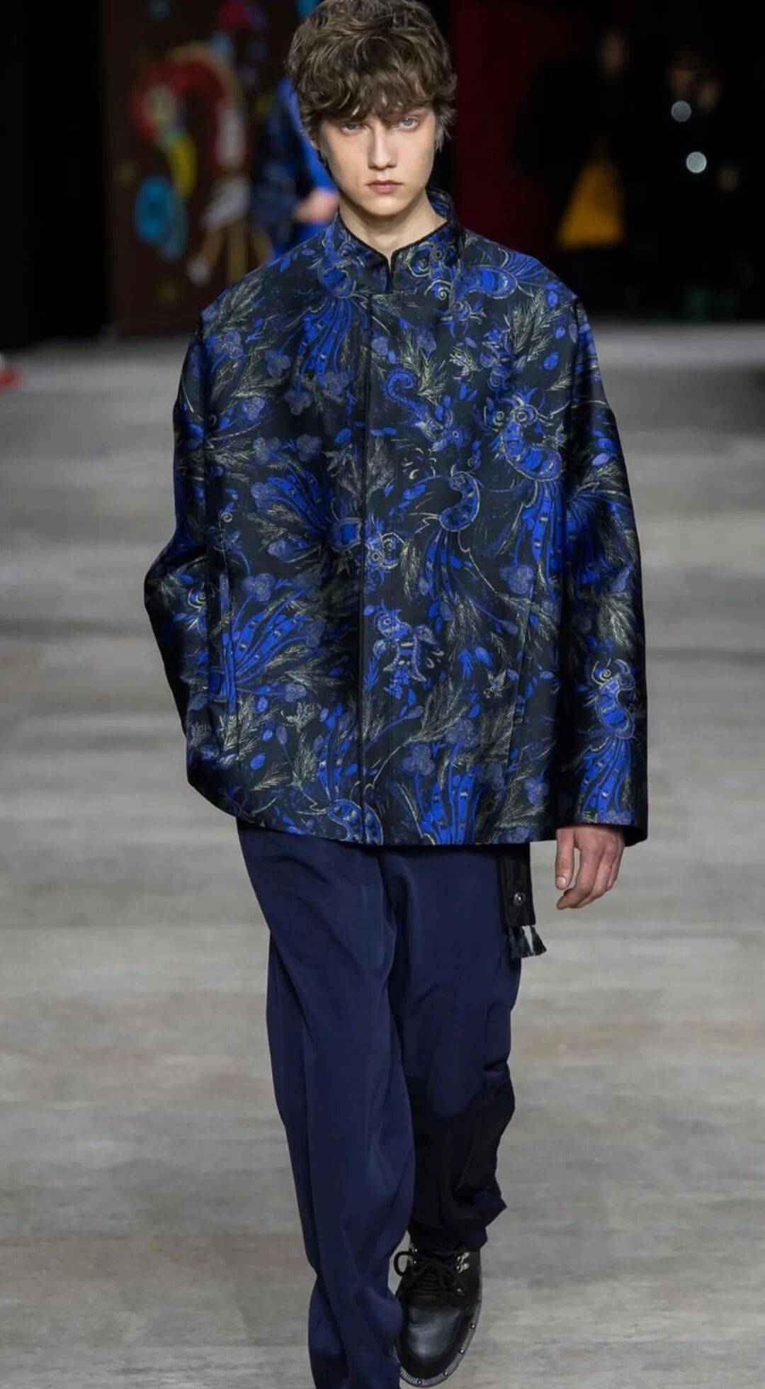 服装在这些色彩和面料等视觉的对比,在衣领和门襟等位置也展现了鲜明清晰的层次感,视觉之中展现了不对称的视觉差异感。