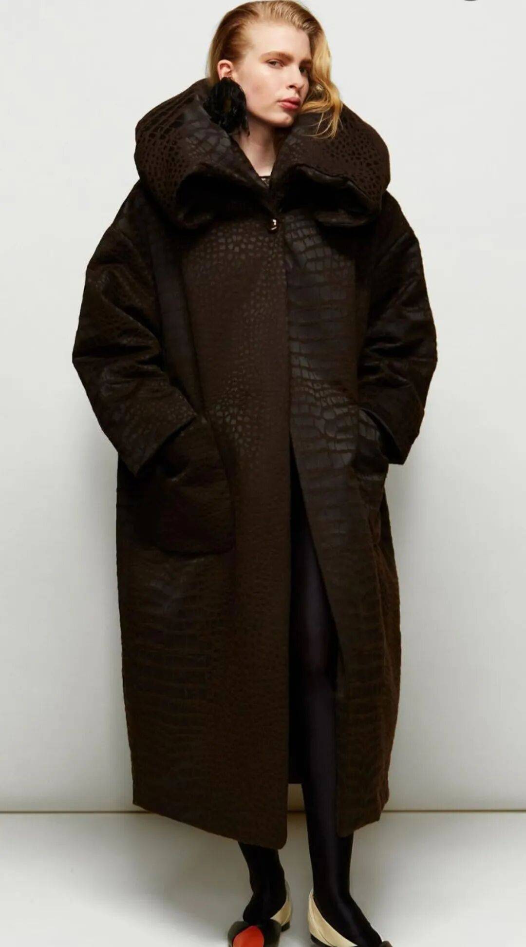 *棕色的大衣在宽松的廓形中,A字的廓形线条也在面料质感中,边缘也在花纹的装饰更多了线条感,还在领口的位置,针织高领让穿搭多了层次感。