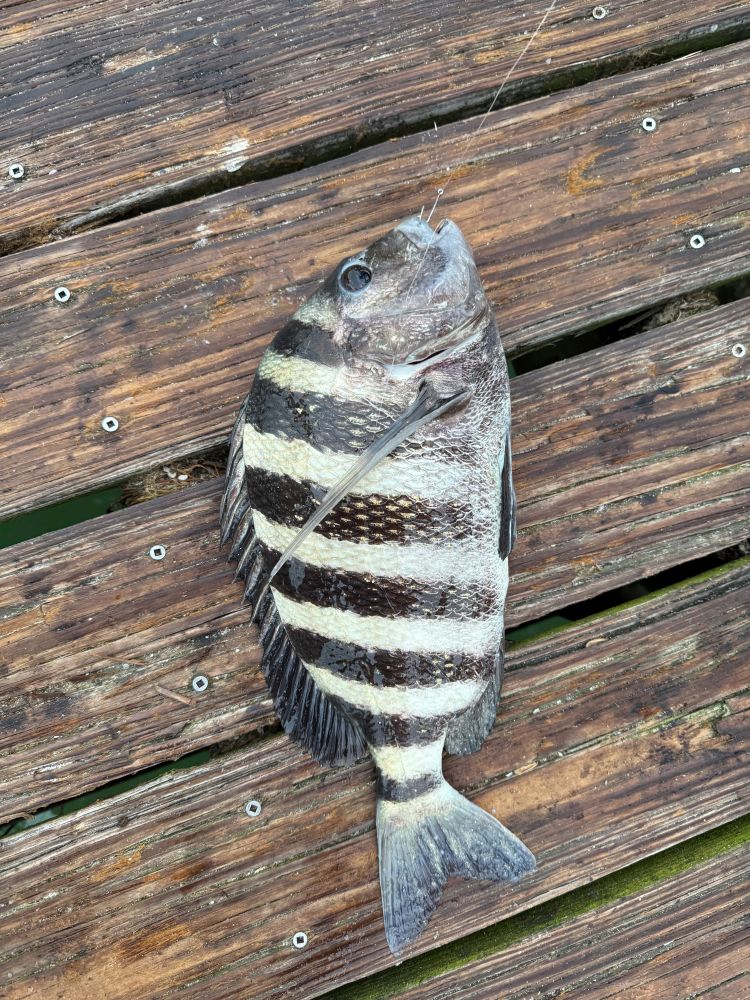 第一次钓到够尺寸的羊头鱼, 最大的一条16英寸多。这鱼是“惯犯”,嘴上已有一个钩子了,这下遇到高手了吧!