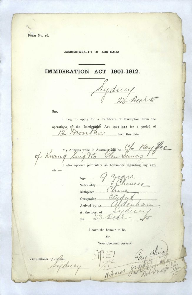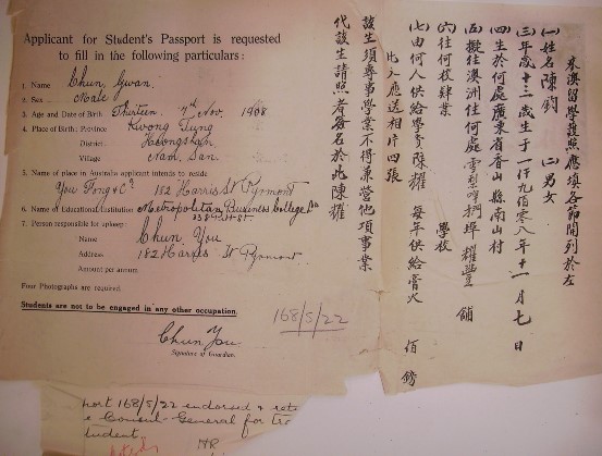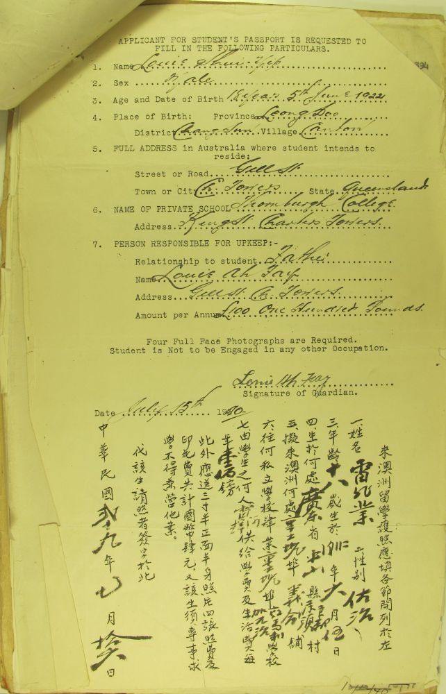 刘初(LowChaw)是香山县石岐南门人,生于一九○八年六月廿二日。当时,在澳大利亚昆士兰省(Queensland)北部重镇坚时埠(Cairns)经商的郑泉(JangChin),是他的表兄。郑全生于一八八○年九月十八日,大约在一九○○年前后从家乡来到澳大利亚发展[1]。档案中没有说明郑泉来自香山县具体的哪个村镇,但当时在坚时埠经[