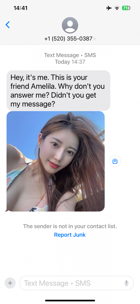 2025.8.4.在扔掉两个莫名其妙的拉近乎的文字短信后,立即又来了一个附有妙龄女郎照片的短信,骗子无处不在,堪称无所不用其极!奈何金刚不坏之躯,刀枪不入,水火不侵,岂小妖们所能驾驭!