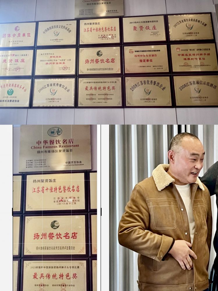 照片1:在聚贤饭庄大厅的一面墙上挂着多种荣誉奖牌;聚贤饭庄总经理老板、央视《舌尖上的中国》中的淮扬菜大师杨军来到我们用餐的包厢,我们当天的午餐[