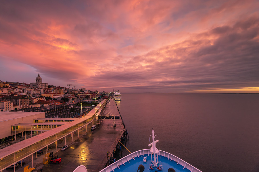 在里斯本市区最后一天清晨又一次来到太阳门,希望早早来能看见日出,天际泛起暖色,阳光从厚云下面露出,撒向大海。