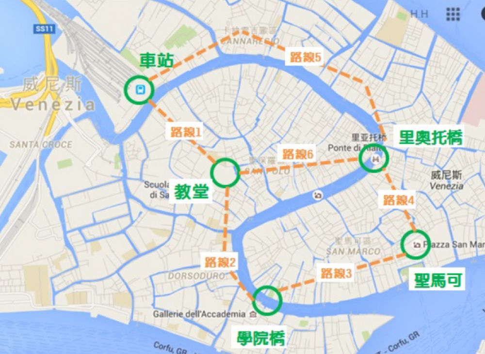 威尼斯是个温情的城市。它的主岛便是这温情的源头,因为威尼斯主岛是由数不清的水巷编织而成,丝丝柔意尽在其中。我们在威尼斯的二日半的行程便是从主岛的水巷漫步开始。一位网友关于威尼斯漫步路线的贴子成了我们这次步行路线的具体指导。从主岛火车站旁的酒店出发,一切都变得相对容易。我们选择了下图中由路线1、路线6、和路线5组成的小环线。