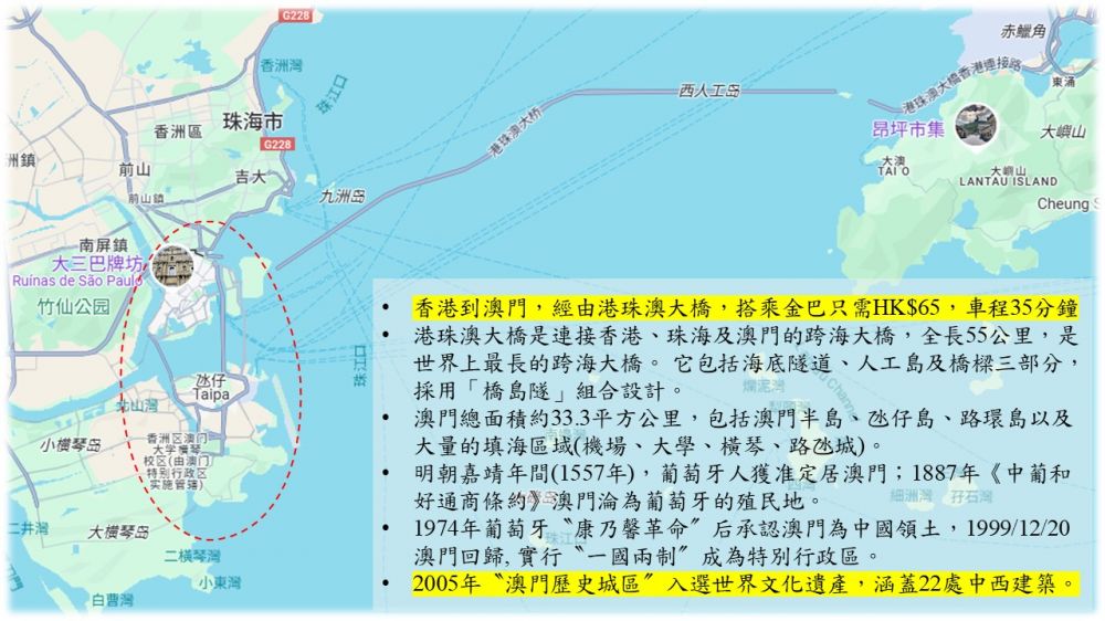 多年以前,曾去過澳門,留下的印象只有大三巴牌坊和賭場。據說澳門回歸以後,經濟起飛,改變很大,人均所得在全球名列前茅。這趟澳門自由行,想體驗世界最長的跨海大橋(港珠澳大橋),也想看看賭場以外的澳門地理歷史和生活文化。從香港到澳門,經由港珠澳大橋,全長55公里,搭乘過橋專用的金色巴士(金巴)只需HK$65,車程35分鐘,沿途看看海上風光,很快就到澳門口[