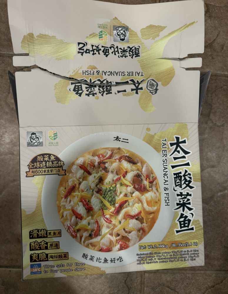 周五去99ranch,看见有一个叫太二酸菜鱼的东东在打折$36变$29,里面的鱼片是黑鱼,买了一盒,包装上看里面有三份。