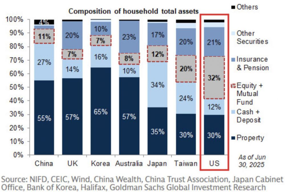 最近,我看到一个对比几个国家和地区的家庭资产配置的图表,就是下图。
