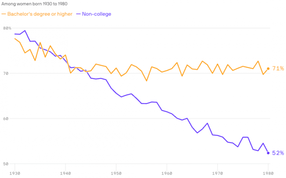 而在25到34岁这个年龄段里,47%的女生拥有了大学本科学历,而只有37%的男生拥有本科学历。也就是说,每100个拥有大学本科学历的年轻女性,只对应大约80个拥有本科学历的男生。