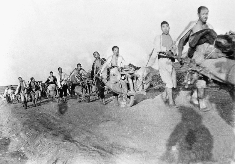 淮海战役中,广大群众用肩挑、车推、驴驮、船运等办法,将大量粮[
