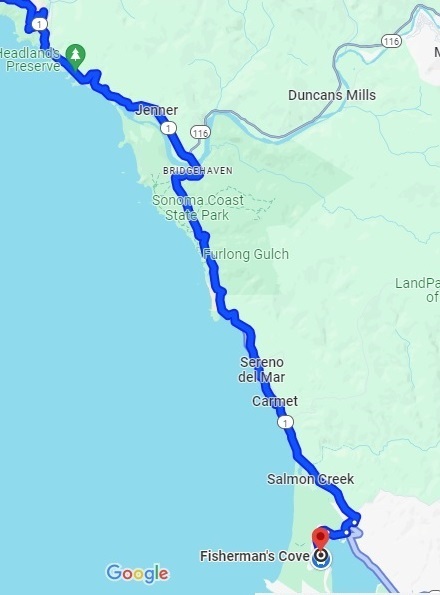 我们比小小阿立早些出门,慢悠悠开车,休闲轻松。沿海北上这一段公路基本没有弯弯绕。9点多出门,11点出头就到了BodegaBay小渔村的海湾好去处。