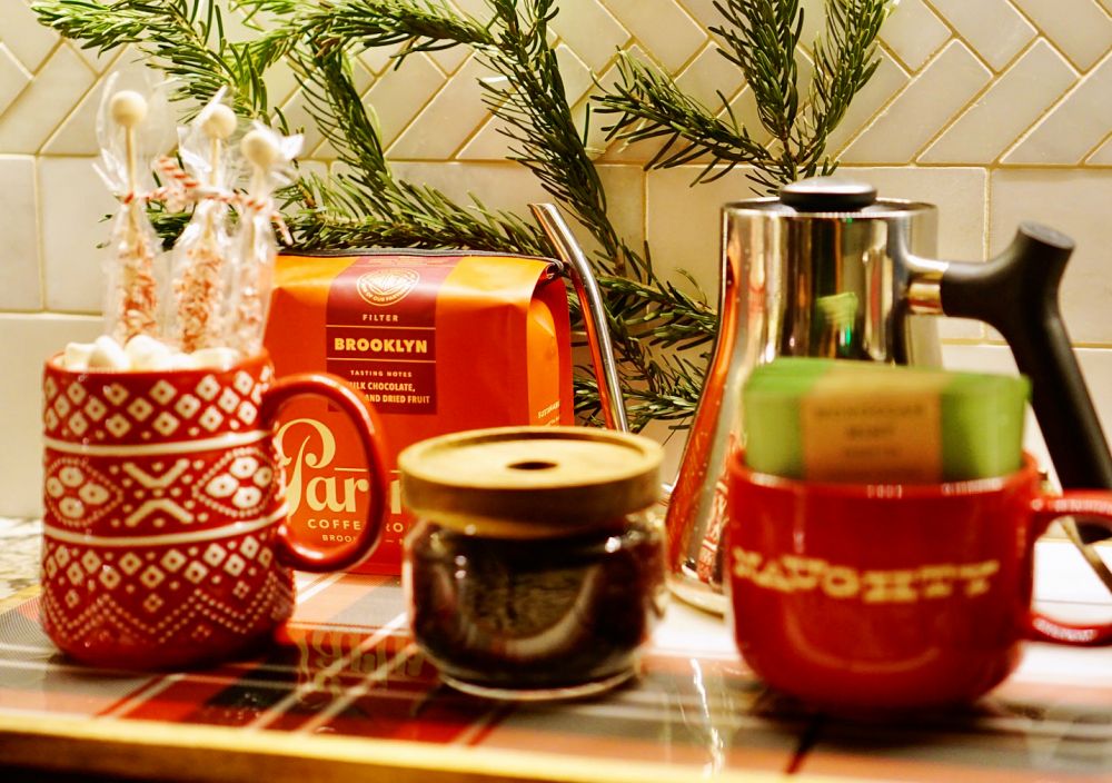 Coffee and tea station. 圣诞树剪下来不要的枝别扔掉,到处都可以用用