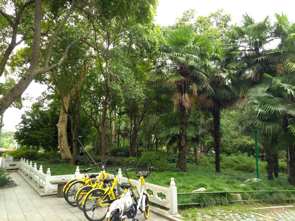 照片3-5: 在怡春吃完早点后,我和先生决定徒步漫行回家,沿途所见的共享单车、咖啡馆、苹果店。。。