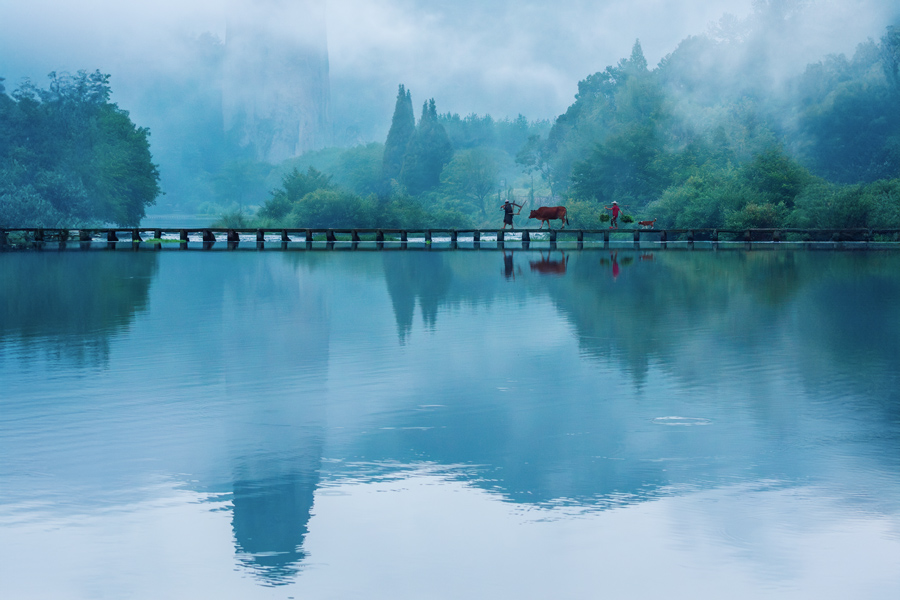 然而,清晨的鼎湖才是拍照的最好时机,这个地方清晨有云雾是大概率的事,景区还要安排模特走台:老农扛犁头牵牛,妇人挑菜,后面跟两条狗,缓缓走过石桥。清晨的雾会将人物轮廓跟背景拉开层次。我们5点就出动过桥,在湖边拉开阵势,老农,牛和妇人已经在对岸等待,准备上场。天光渐亮时,老农一行开始缓缓进发,神奇的事发生了,潭中升腾起了雾,原本清晰的石峰被云雾包围,真是“仙都”啊!