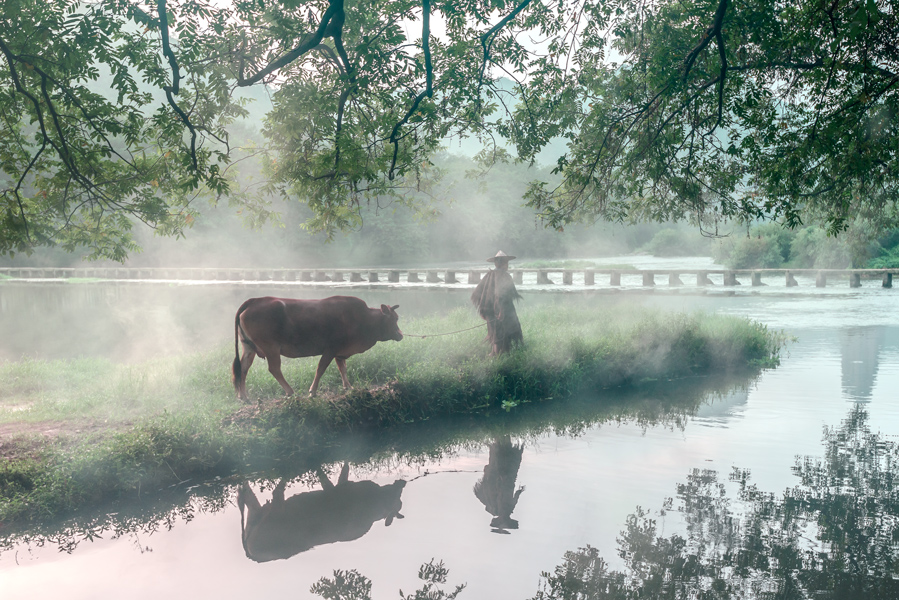 我们从远处拍到近处,发现如果太远,主体就比较小,近处拍摄有个好处,就是做为主体的老农一行可以拍的比较大,但是很难避开岸边的地面以及站在那里的游客。老农一行来来回回走了好几趟。朝阳出来后,领队把大家召集起来,要换一个角度拍了,就在岸边。水里有一尖尖角的草滩,岸边是大树,老农牵牛在草滩上踱步,人、牛和树丛在水中形成倒影。