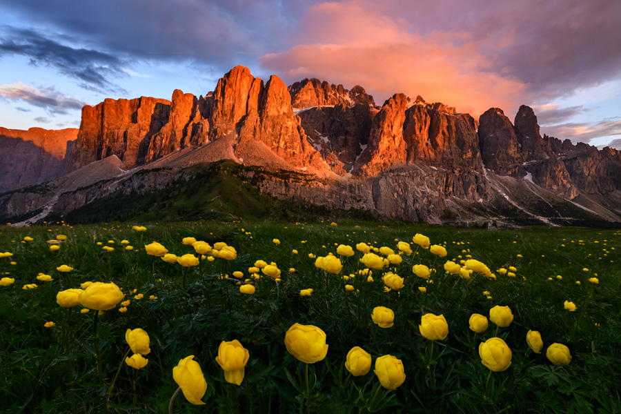 多洛米蒂山风景本身就很好。博主的多张照片里还捕捉到了日光照在云层上折射出绚丽的色彩,近景的野花又增添了生命的活力,是三好。