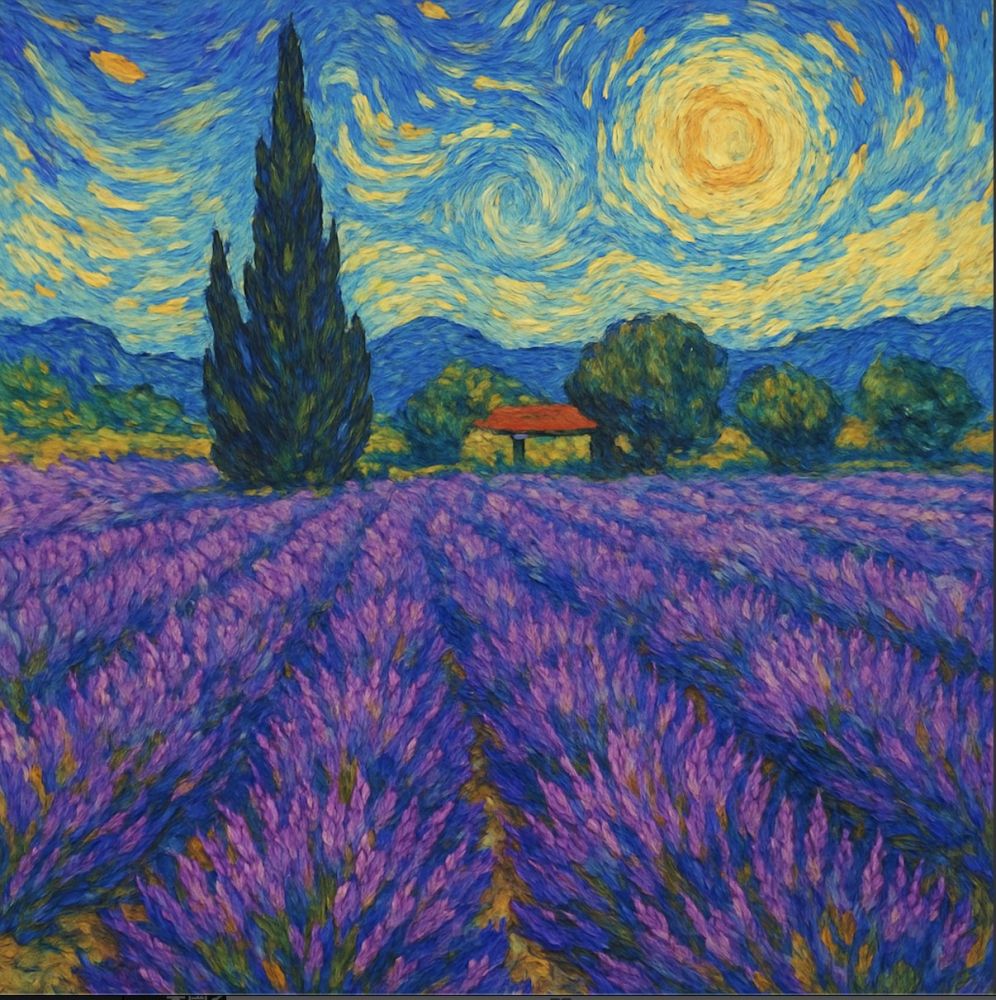 回想这些年见过的梵高作品,他画过向日葵,也画过麦浪,葡萄园,橄榄树,唯独没有画过薰衣草。我好奇查证了一下。据记载,整个中世纪,薰衣草在普罗旺斯一直被广泛种植,当地修道院和草药医生都用它来治疗疾病,在普罗旺斯大面积种植薰衣草是19世纪的事情。AI的解释是梵高居住的阿尔勒,圣雷米和奥维尔,这地方薰衣草田稀少甚至没有,他并没有将其作为绘画主题。但我相信梵高在普罗旺斯肯定见过薰衣草,他为啥不画我觉得肯定有原因?就算是他的一个秘密吧。不过,为了满足我的好奇心,我让AI按梵高的风格,画了一幅薰衣草的油画。别说,还真有点意思。