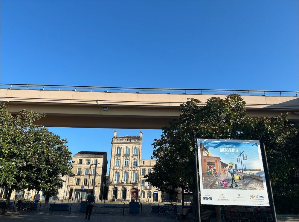 沿着河滨步道继续往北,就来到了雅克·沙邦·德尔马斯大桥(Pont Jacques Chaban Delmas),这座桥长575米,高77米,是法国乃至欧洲最高的升降桥。这座建于2013年的混凝土钢桥的特点是桥面在船只通过时可以保持平行,也就是通过4根柱子整个桥面被升起来。据说在夜晚,夜幕降临,桥上灯火通明,为城市增添了另一抹美丽的色彩,尤其桥塔灯光颜色的变化,蓝色代表涨潮,而绿色代表退潮。加龙河是河,不是海,怎么有涨潮一说?原因很简单,加龙河肯定是河,但大桥离海(北边)很近,海水涨潮退潮都会影响河水水位。