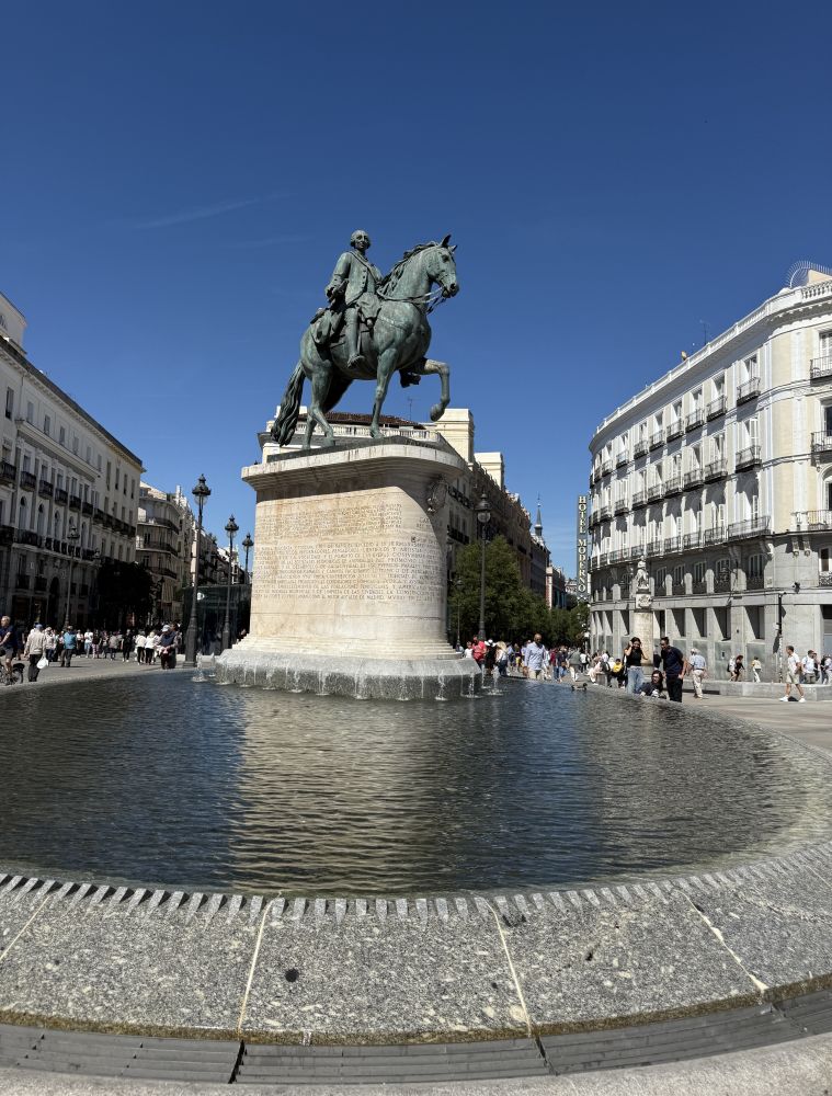我们的第一站,是马德里市中心的太阳门广场(Puerta del Sol),广场呈半圆形,街道放射状向外延申。蹭了一个英语旅行团的讲解,得知这个熊与草莓树的雕塑是马德里的城市符号,象征着这座城市自然与人文的和谐,强调城市的可持续性发展。