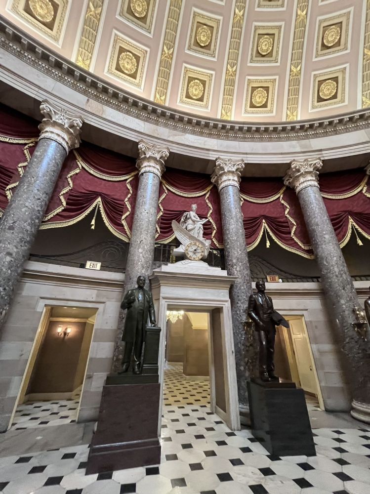 有很多细节,应该也有很多故事吧,我们只是随着参观的队伍急匆匆地转了一圈。以咱旅游的时候一直眼观六路、耳听八方的敏锐,在国会大厦大众导游的最后一句结束语里,瞬间发现了可以登顶国会大厦的机会。也就是说我们还有机会可以参观位于顶楼层的参议院和众议院会议大厅,就是咱老百姓平时在电视上看到的美国参议员们和众议员们开会、辩论和投票的地方。