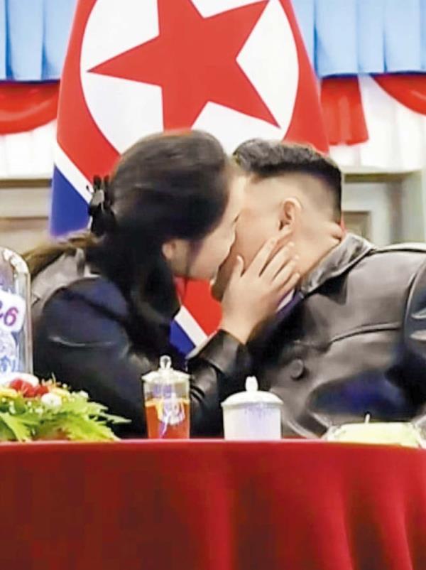 - ▲ 1日,在朝鲜平壤举行的新年庆祝演出上,新年倒计时结束后,国务委员长金正恩女儿金主爱正在亲吻其父脸颊。/ 朝鲜中央电视台