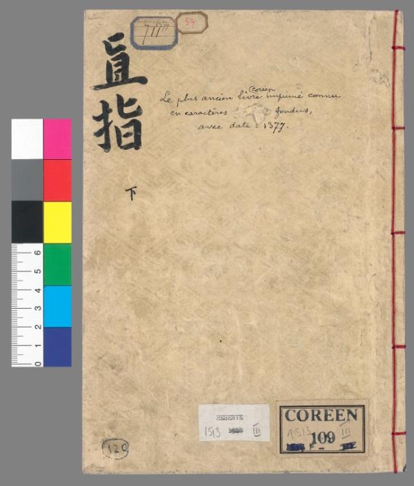 《直指》是高丽禑王3年,即1377年在忠清北道清州兴德寺用金属活字发行的书籍。该书看起来应由上、下两卷组成,但只有下卷流传至今。据悉,该藏本由先后担任朝鲜法国代理公使(1888-1891)和公使(1896-1905)的外交官维克多·柯林·德·弗兰西(1853-1924)从朝鲜购买后带回法国。后经古董收藏家亨利·维佛之手捐赠给法国国立图书馆。此后一直收藏于该图书馆,它不同于2011年以出借的形式返还的《外奎章阁仪轨》,并非遭到掠夺的文化遗产,因此难以将其视为理应返还的文物。