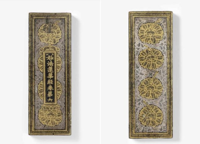 - ▲ 《妙法莲华经卷第六》的正反两面的封面。用金粉绘成四朵莲花,周围布满了银色的花藤图案。/ 驻国外文化遗产财团