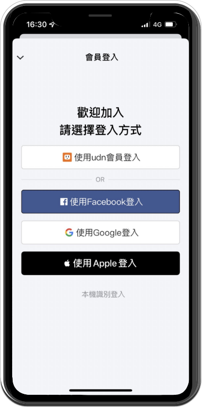 登入方式可使用 udn 會員註冊或第三方登入,註冊完畢後驗證資料即可成為會員。