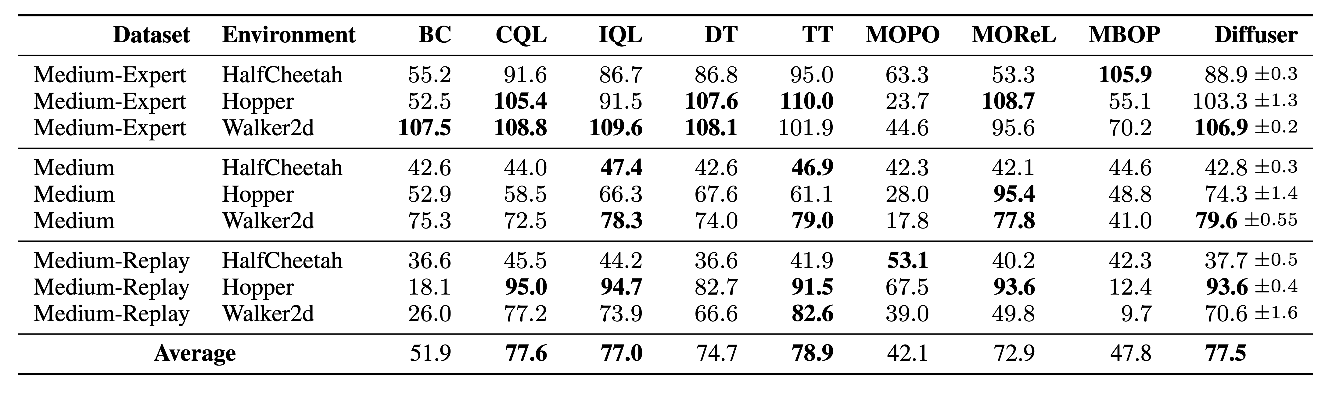 \multicolumn{1}{r}{\bf \color{black} Dataset} & \multicolumn{1}{r}{\bf \color{black} Environment} & \multicolumn{1}{r}{\bf \color{black} BC} & \multicolumn{1}{r}{\bf \color{black} CQL} & \multicolumn{1}{r}{\bf \color{black} IQL} & \multicolumn{1}{r}{\bf \color{black} DT} & \multicolumn{1}{r}{\bf \color{black} TT} & \multicolumn{1}{r}{\bf \color{black} MOPO} & \multicolumn{1}{r}{\bf \color{black} MOReL} & \multicolumn{1}{r}{\bf \color{black} MBOP} & \multicolumn{1}{r}{\bf \color{black} Diffuser} \\