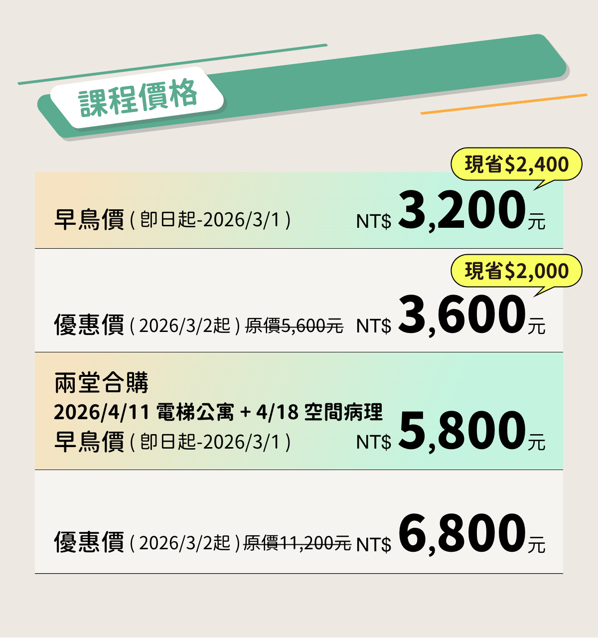僅限「實體課程」可申請退款;實體課程開始前十個工作天內、以及開課日之後,恕不受理退款,但可轉讓他人使用。