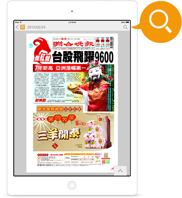 將紙本報紙印刷版以數位檔案形式,提供瀏覽及查詢。內容包含新聞、圖表、廣告,並依報紙原編排形式呈現。提供離線閱讀功能,隨處都可瀏覽,也可以隨時暫停下載。