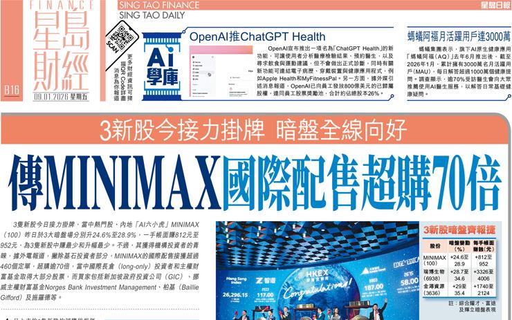 傳MINIMAX國際配售超購70倍 3新股今接力掛牌 暗盤全線向好