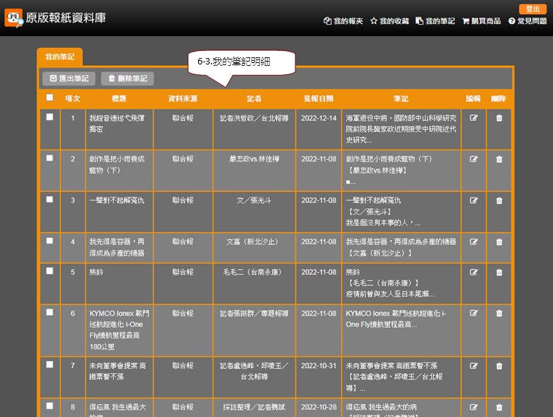 A:「我的收藏」、「我的筆記」是原版報紙影像資料庫看單則新聞內文時提供給會員蒐集資料及註解個人感想的個人化管理工具。
