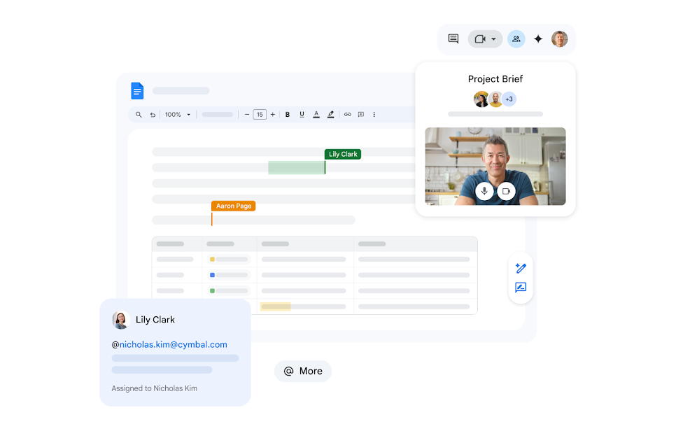 Discuss changes and review projects in real-time with and . Start a Meet call directly from Docs, Sheets or Slides, or in Chat for ongoing reference and collaboration by a team.