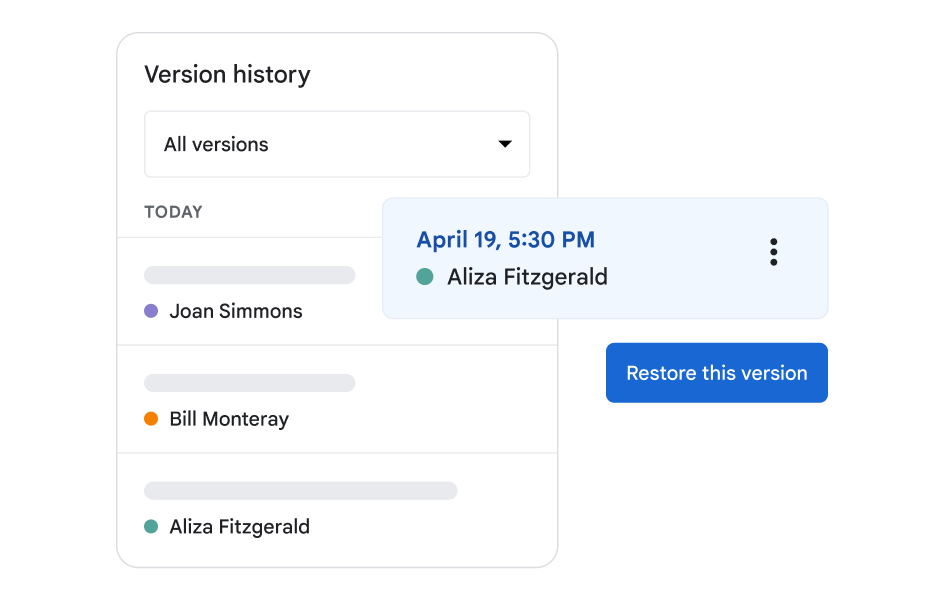 Docs, Sheets, and Slides let teams edit files simultaneously, saving time while working together. Share insights via comments to improve deliverables and see what’s been changed by reviewing version history.