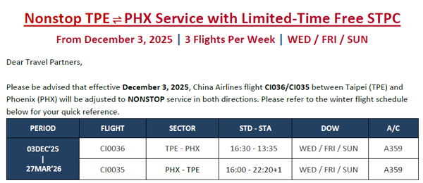 华航将于2026年8月5日起增飞纽约-台北! 华航已于2025年12月3日起直飞凤凰城-台北! 华航已与Southwest 西南航空合作联运,衔接旅客的好消息!