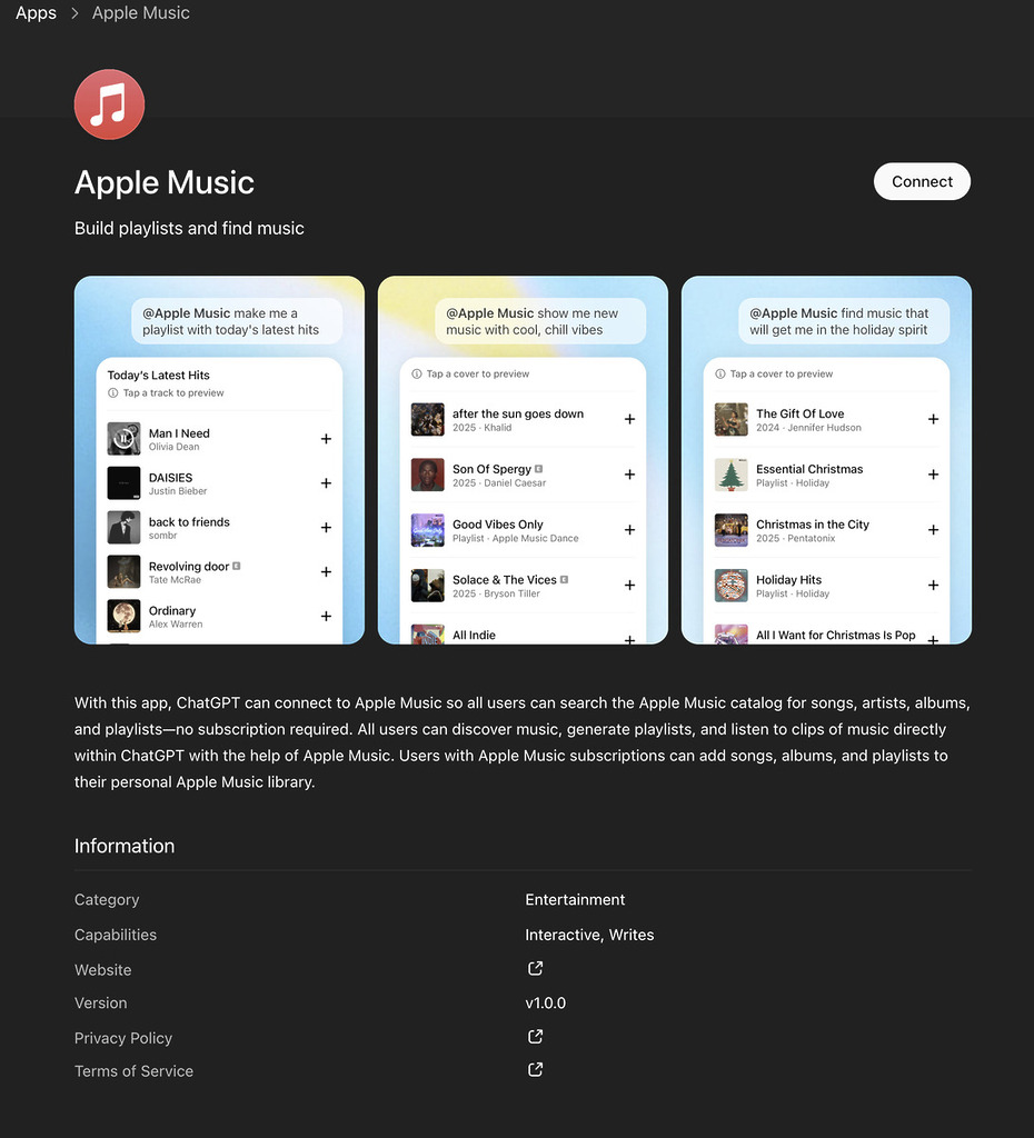 今年 10 月份 OpenAI 宣布整合了 Spotify,可以透過 ChatGPT 整合包括 Spotify 音樂串流平台,用 AI 幫手製作歌單。今日 OpenAI 也將 Apple Music 已正式支援 ChatGPT,Apple Music 訂戶現可透過自然語言指令搜尋歌曲、建立歌單,並直接將結果加入個人音樂庫,毋須逐一手動搜尋與新增。