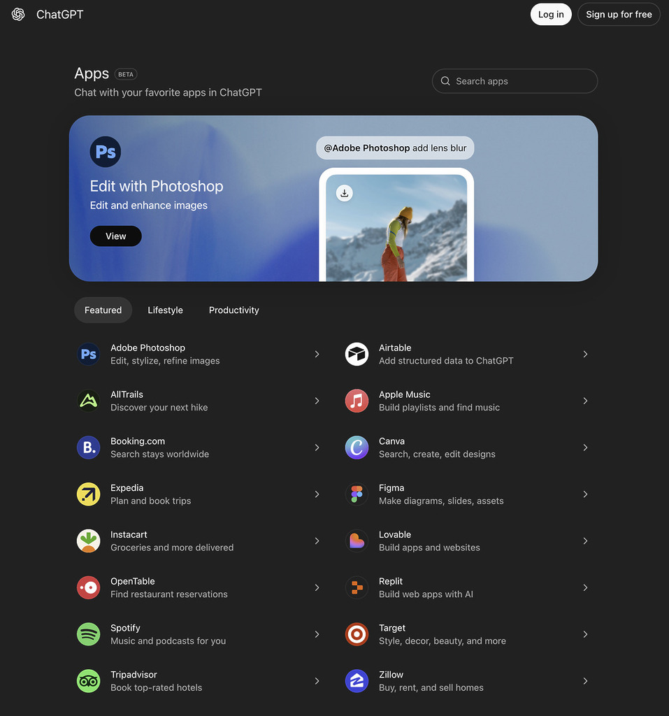 - 以瀏覽器前往 chatgpt.com/apps,或在 ChatGPT 介面內開啟「Apps」分頁。