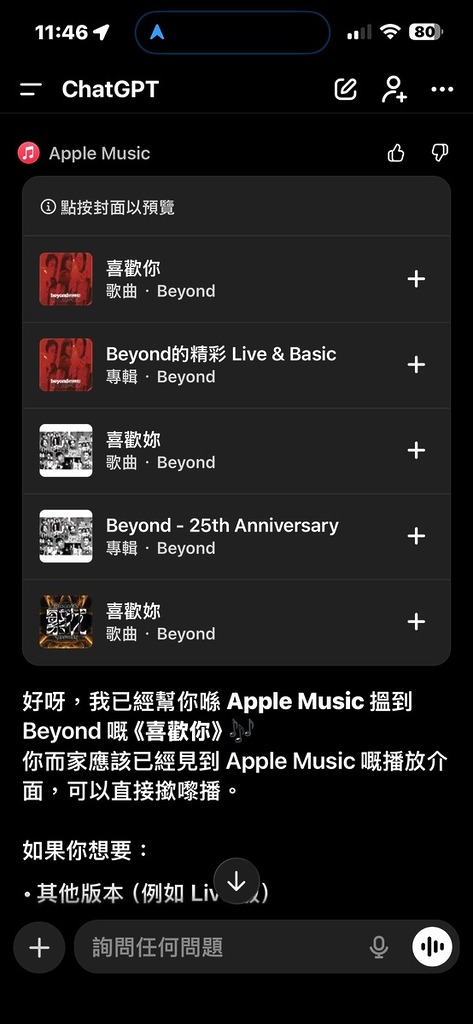 - 協助尋找記不起歌名的歌曲: 若只記得片段,可輸入「播放那首《無間道》裡由劉德華唱的主題曲」,或「找出那首副歌不停唱『喜歡你』的 Beyond 歌」,ChatGPT 會嘗試辨識並在 Apple Music 中搜尋對應廣東歌,例如〈無間道〉、〈喜歡你〉等,方便用戶重新加入音樂庫。